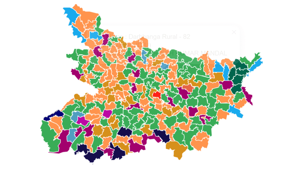 NDA’s Nirvana: BJP’s urban surge (Patna Sahib, Bankipur) and JD(U)’s rural roots (Muzaffarpur, Vaishali) meshed into a 71% strike rate. LJP(RV)’s Paswan pull netted 19, HAM(S)’s EBC echo added 5—alliance alchemy at work. Mahagathbandhan’s Meltdown: RJD’s Yadav fortress (Raghopur, Madhubani) held 25, but Congress’ 9% strike rate (down from 20%) exposed alliance anemia. Left’s 2 seats (CPI(ML)(L) in Tarari) whisper worker woes. JSP’s Jolt: Zero wins, but 5-10% in 15 seats (Darbhanga, Jokihat)—a “third pole” tease for 2030.